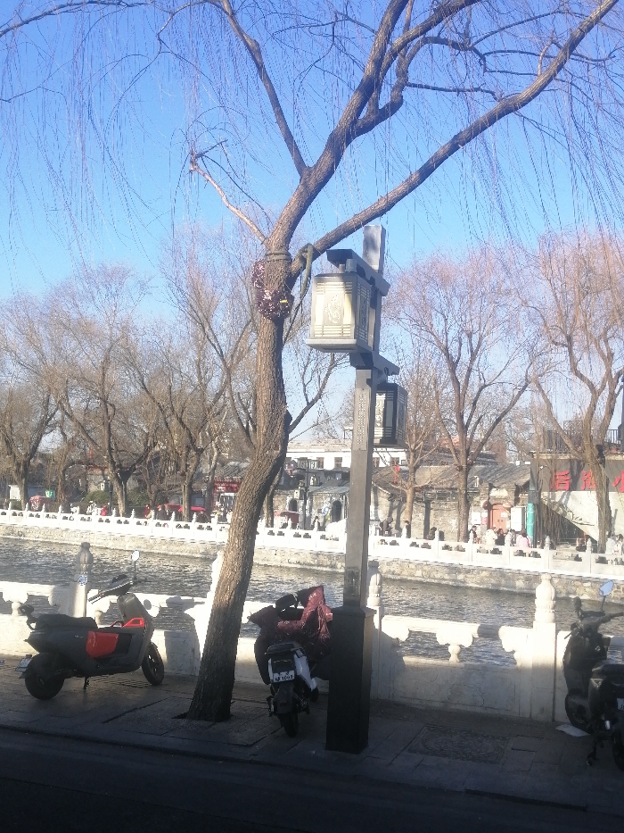 The image depicts a daytime street scene along a canal in an urban environment, consistent with Beijing's Xicheng District, China. The sky is clear and blue. In the foreground, a paved concrete sidewalk occupies the lower portion of the frame. Three motor scooters or electric bicycles are parked on the sidewalk. From left to right, a black scooter with red accents is visible, followed by a dark-colored scooter with a maroon covering draped over its rear, displaying a partially visible license plate "BJ 1699". A third dark-colored scooter is partially visible on the far right. A slender deciduous tree, characterized by dark bark and bare, drooping branches typical of a willow, stands on the sidewalk slightly left of center. A small, dark, intricately textured object is tied around its trunk. Adjacent to the tree on the right, a dark grey street lamp post rises, supporting two vertically stacked, rectangular lantern fixtures with intricate patterns on their panels. A rope or cable extends from the lamp post and is tied around the tree trunk. The midground features a narrow canal or river with a visibly rippled water surface. A white stone balustrade, comprising multiple decorative pillars, lines the opposite bank of the canal. Beyond the balustrade, numerous bare deciduous trees stand along the water's edge. Approximately 15-20 individuals are visible on the far bank, walking or standing in groups. Behind these individuals and trees, traditional Chinese-style buildings are present, featuring dark tiled roofs and light-colored walls. One building on the right side displays a large white banner or sign with prominent red characters. The background consists primarily of the clear blue sky, with faint outlines of distant structures visible through the upper branches of the trees. The overall setting suggests a historical or pedestrian-oriented area within the city.