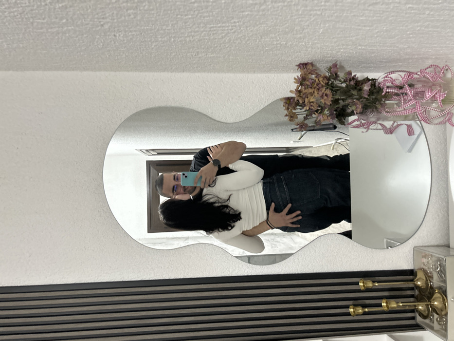 The image depicts an indoor scene in Zlatograd, Bulgaria, captured via a mirror selfie. A male and a female individual are reflected in a large, irregularly shaped mirror. The male, positioned behind the female, is taking the photograph with a light blue smartphone held in his right hand. He has short dark hair, a beard, wears eyeglasses, a black t-shirt, and a dark watch on his left wrist. His left arm is wrapped around the female's waist, with his hand resting on her left hip/buttock. He appears to be smiling. The female, facing away from the camera, has long dark hair and wears a white long-sleeved top and dark blue jeans. Her left arm is around the male's back. To the lower left, on a white surface, are three brass-colored candlesticks of varying heights and a clear rectangular organizer. To the lower right, on the same surface, is a clear glass vase containing dried light brown flowers, adorned with a pink and white checkered ribbon. The wall surrounding the mirror is white with a textured finish. To the far left, a vertical panel with dark, narrow slats is visible. A doorway is reflected in the background within the mirror.