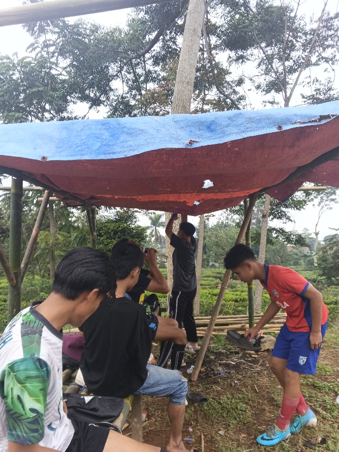 This image depicts four males gathered under a makeshift canopy in an outdoor area, likely a tea plantation, near Dalat, Vietnam. The canopy consists of a blue and red tarpaulin supported by bamboo poles. On the far left, a male is partially visible from behind, wearing a white shirt with green leafy patterns. To his right, another male sits, wearing a black t-shirt and blue jeans, raising a clear plastic bottle to his mouth. A third male stands in the center-right, wearing a dark grey t-shirt and dark striped pants, reaching upwards to the tarpaulin structure. On the far right, a fourth male, dressed in a red and blue sports jersey (bearing "PUMA"), blue shorts, red socks, and blue soccer cleats, bends down, holding a black shoe or object near the dirt ground. The immediate ground is dirt with sparse grass and some visible refuse. The background reveals rows of green low-lying plants characteristic of a tea plantation, interspersed with various trees, all under an overcast sky.