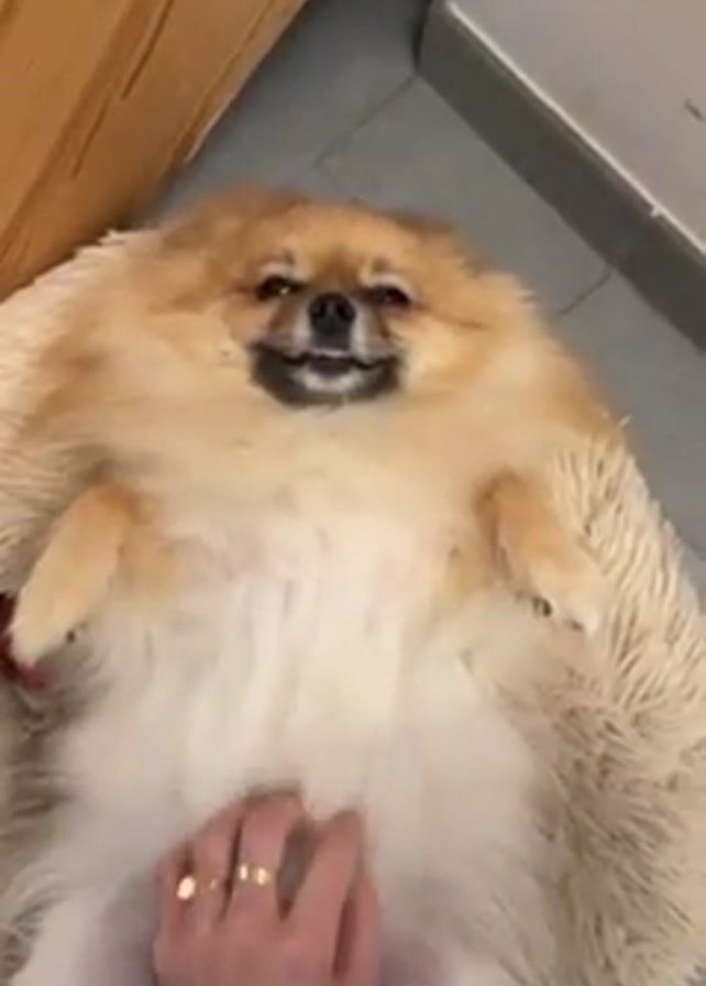 A person is petting a chubby, tan and white Pomeranian dog that is lying on its back in a round, furry dog bed. The dog looks content and has its eyes squinted shut. The person has a black sleeve and gold rings on their fingers. The background includes a light wood cabinet and a gray tiled floor.