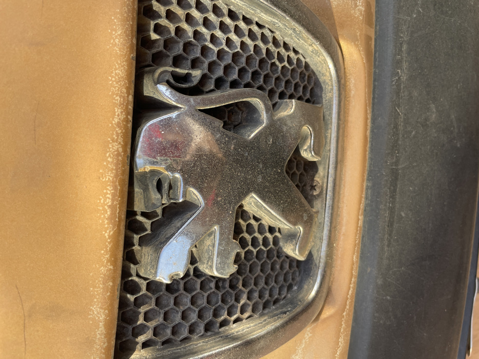 A close-up shot reveals the front grill and emblem of a Peugeot vehicle. The emblem, a stylized lion, is prominently displayed against a hexagonal mesh grill. The emblem and grill appear aged and slightly dusty, suggesting use and exposure to the elements. The surrounding vehicle bodywork is a light tan color on one side and dark grey or black on the other. A screw is also visible near the emblem.