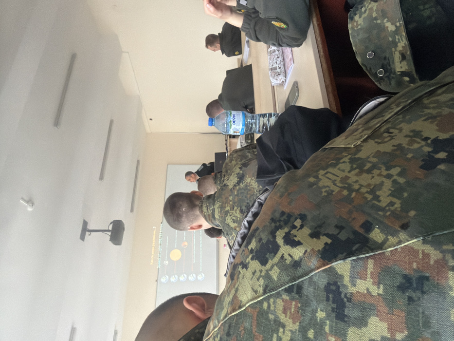 The image depicts a classroom or lecture hall within a military educational institution in Dolna Mitropolia, Bulgaria, likely the Georgi Benkovski Higher Air Force School