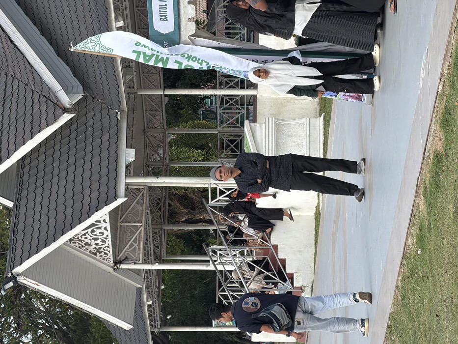 The image depicts an outdoor scene in Lhokseumawe, Indonesia, featuring a pavilion-like structure and multiple individuals. In the background, a white and dark-tiled pavilion stands, characterized by a multi-peaked roof with white soffits and ornate white decorative gables and railings. A floodlight is mounted on the front edge of the pavilion's roof. Below the pavilion, a group of approximately six individuals, primarily women dressed in head coverings (hijabs) and dark clothing, are seated on white concrete steps. A small child in a red top is partially visible among them. In the mid-ground, a white and green vertical banner with text, including "BAITUL MAL Lhokseumawe" and "ZAS," is visible on the right, attached to a light-colored frame or stand. The foreground consists of a flat, light-colored paved surface, with a strip of green grass visible at the bottom edge. Three individuals are prominent in the foreground: 1. On the left, a male subject walks away from the camera, facing right. He wears a dark short-sleeved collared shirt with a circular patch design on the back, light-colored jeans, and light-colored sneakers. A grey sling bag is worn across his body. 2. In the center, a male subject stands facing forward with his arms crossed. He wears a dark long-sleeved patterned shirt, dark trousers, and a grey skullcap. 3. On the right, a young female subject stands facing forward, positioned to the left of the banner. She wears a white hijab, a dark green long-sleeved top, dark trousers, and white clogs. A dark object is held in her left hand. To her immediate right, a portion of another female subject, wearing a black hijab and a striped skirt, is visible. The overall environment is well-lit, suggesting daylight, with trees visible behind the pavilion.
