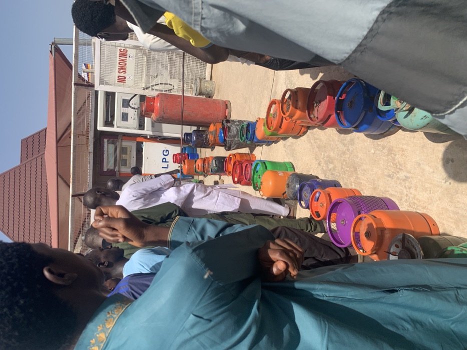 The image displays an outdoor LPG (liquefied petroleum gas) refilling station in Dutsinma B, Nigeria, under a clear, bright sky