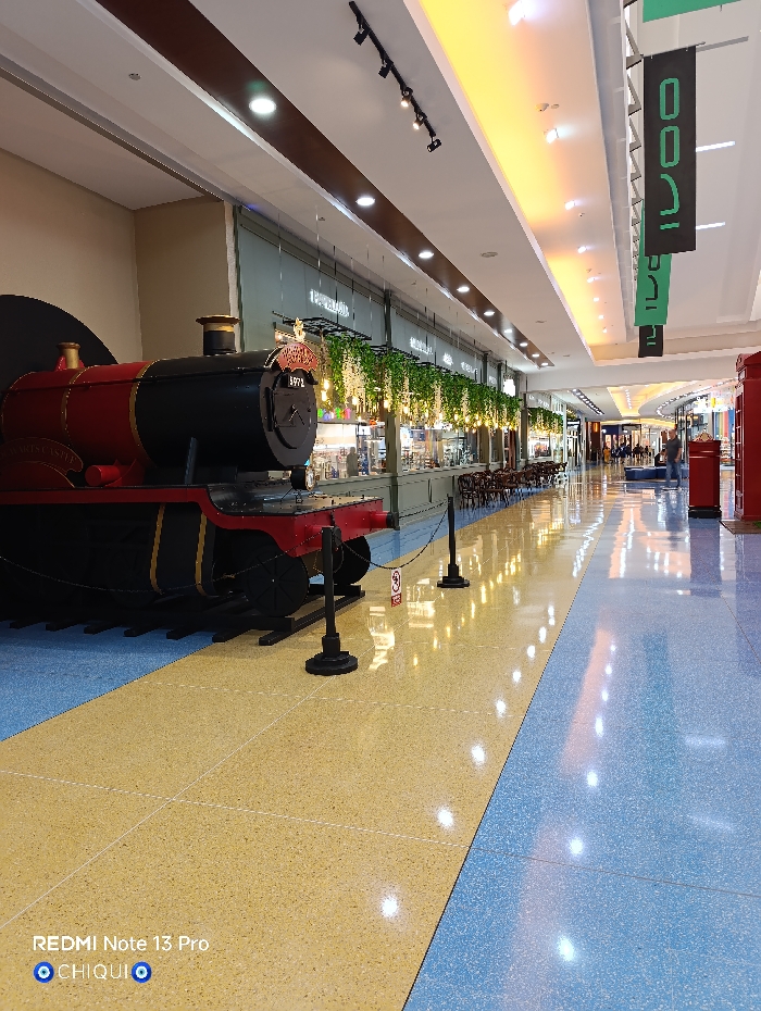 This image depicts an indoor commercial corridor, identified as being in Porlamar, Venezuela. The scene features a large, static display replica of a red and black steam locomotive, styled similarly to the Hogwarts Express, positioned on the left side of a wide pedestrian walkway. The locomotive has a red boiler, a black smokebox with "3972" displayed, and "Hogwarts Castle" lettered on its side. It is cordoned off by black stanchions and black ropes. The floor is clean and highly reflective, composed of distinct sections: a light yellow terrazzo-style pattern beneath and immediately surrounding the locomotive, and a light blue terrazzo-style pattern covering the right portion of the walkway. These two sections meet along a clean, diagonal seam. Along the right side of the corridor, several storefronts are visible, some featuring glass panels. One establishment displays decorative hanging greenery with numerous small, illuminated string lights, suggesting a café or restaurant setting. Further down the corridor, tables and chairs are arranged in front of this establishment. The ceiling is white with various types of artificial lighting, including recessed spotlights, track lighting, and linear cove lighting, which collectively illuminate the space and reflect brightly on the polished floor. In the distance, several indistinct human figures are visible walking along the corridor. A red, British-style telephone booth is partially visible on the far right side of the walkway, towards the middle ground. Green banners with vertical white lettering hang from the ceiling on the far right, with the word "DOON" partially discernible. The lower-left corner of the image contains a watermark: "REDMI Note 13 Pro ◎CHIQUI◎".
