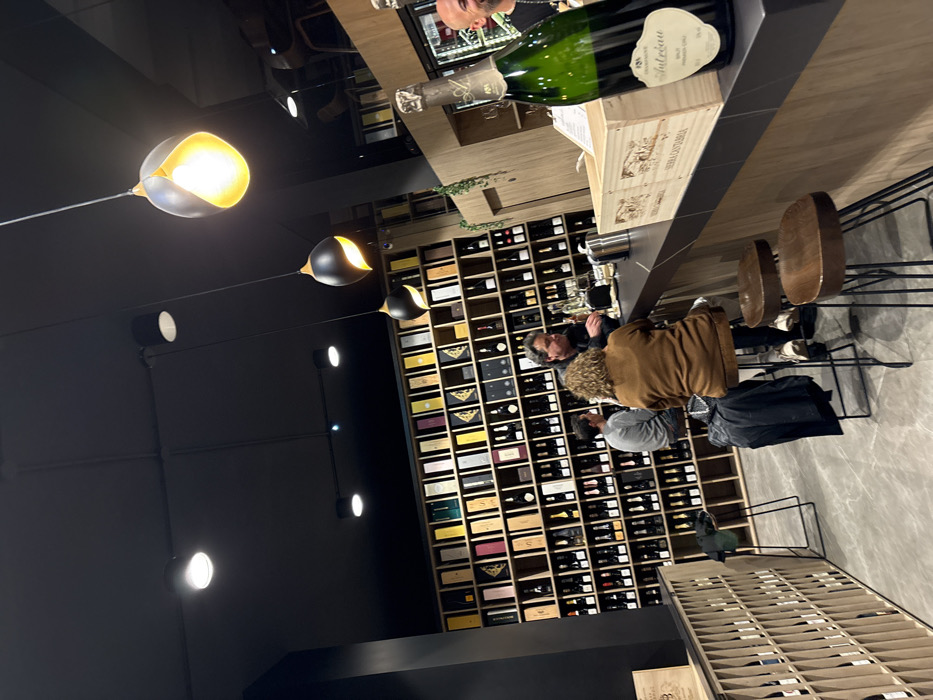 A wine bar features a large display of various bottles, with two customers seated at the counter. One wears a brown jacket and the other a light gray shirt. Wine bottles and wooden crates are on the counter. Lighting fixtures with a unique globe design hang from the ceiling, contrasting with the black walls and gray floor. A gray stone counter with three wooden stools is visible.