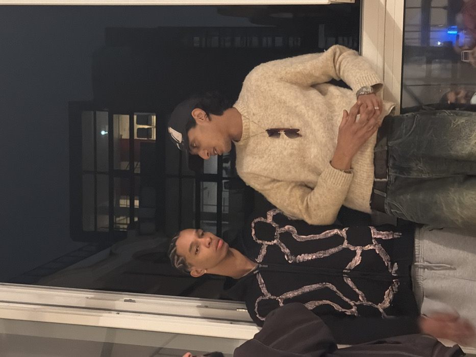 The image depicts three male individuals indoors, positioned near a large window, at night in Saint-Denis, France. The central figure, a young male with braided hair, wears a black zip-up hoodie adorned with prominent white skeletal-like patterns and light grey sweatpants. He looks forward with a neutral expression, his lips slightly parted. A small stud earring is visible in his left ear. To his immediate right stands a second young male, wearing a dark baseball cap with a white emblem, a light beige knit sweater, and dark washed jeans secured by a dark belt. He appears to be speaking, looking towards the central figure, with his mouth open. Dark sunglasses hang from a gold-colored chain around his neck, and a silver-toned wristwatch is on his left wrist. A small stud earring is visible in his right ear. His hands are clasped at waist level. On the far left, partially visible, is the upper-left quadrant of a third male's face, revealing a dark beard and dark clothing. The background visible through the window is dark, indicating nighttime, and shows a multi-story building with several rectangular windows, some faintly illuminated from within. A reflection of a person holding what appears to be a mobile phone is visible in the lower right pane of the window. The interior lighting is subdued, suggesting ambient light sources.