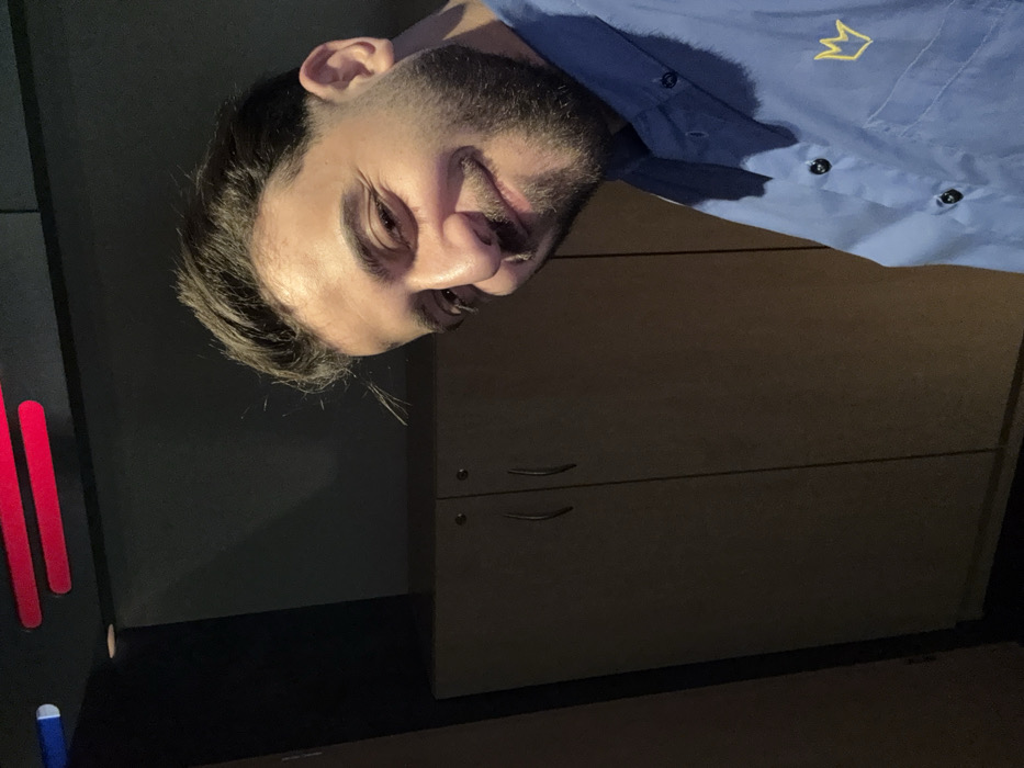 A man with dark hair and a beard smiles sideways at the camera. He wears a light blue button-down shirt with a small yellow crown emblem on the upper right. Behind him is a dark wall with red bars and a cabinet with two drawers. The lighting is dim, casting shadows across the surfaces.