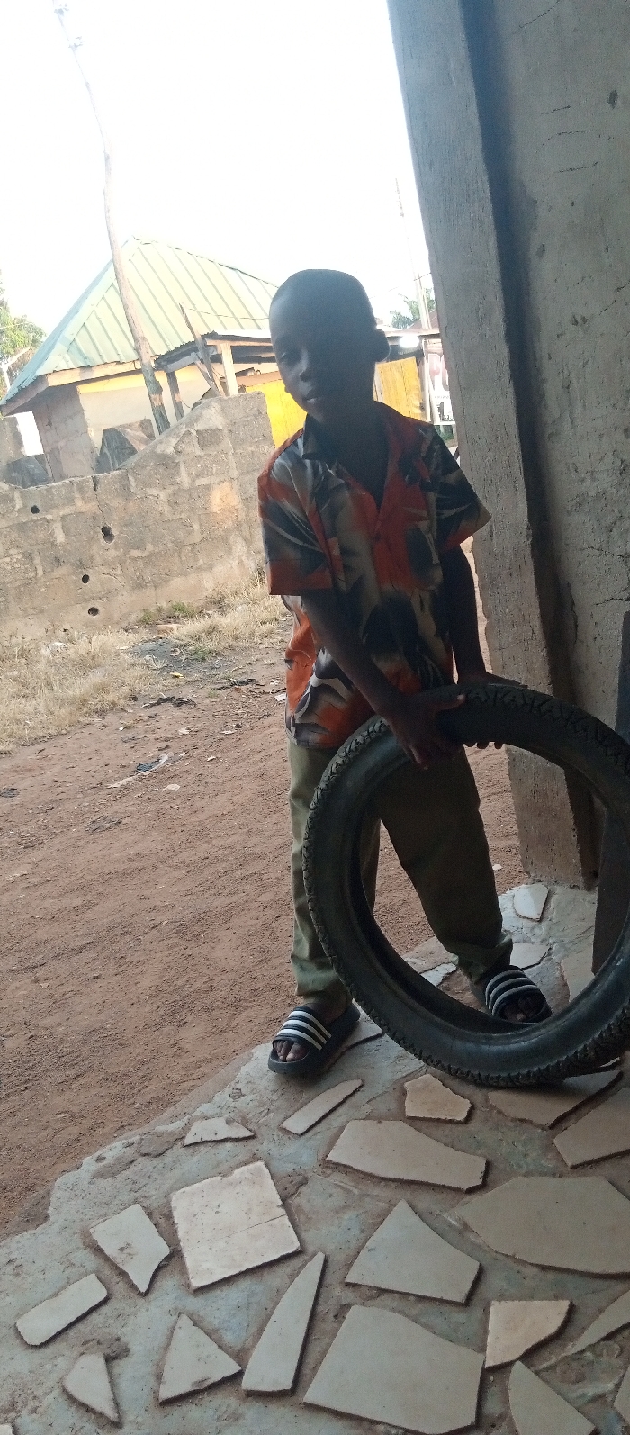 A young, dark-skinned male child stands in a semi-enclosed outdoor space in Akwanga, Nigeria. He wears an orange, black, and white patterned short-sleeved collared shirt, olive-colored trousers, and black and white striped slide sandals. His head is shaved. He holds a dark-colored tire, approximately bicycle-sized, vertically with both hands in front of him. He looks directly forward and slightly to his left. The child is positioned on a concrete surface embedded with various irregularly shaped, light-colored tile fragments. To his immediate right, a rough, light brown concrete pillar or wall section is visible. Behind him, an unplastered concrete block wall, light brown, features multiple small circular holes. Beyond this wall, the ground consists of dry, reddish-brown dirt with sparse, dry vegetation and minor debris. In the background, a building with a green corrugated metal roof and light-colored walls is partially visible, alongside a tall, slender wooden pole or tree trunk. The sky is bright and appears hazy or overcast.