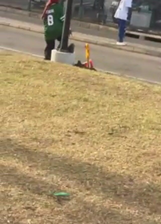 n outdoor scene with a grassy area in the foreground and a road with cars and pedestrians in the background. Several people are visible near the road. One person in a white shirt is standing near the curb, while others are walking in the vicinity. There is also a person in green and red walking near a pole in the foreground. Buildings and billboards are visible in the background, and a few traffic cones are scattered on the lawn.