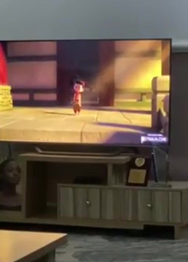 television displaying an animated scene with a cartoon character walking through an Asian-inspired village. The character is small with dark hair, wearing red and yellow clothing. The village consists of traditional-style buildings with tiled roofs and courtyards. The TV is sitting on a light wood-grain TV stand with decorative objects, including a picture of a woman and a golden plaque. The room appears to be a living room, with a wooden coffee table and a patterned rug visible in the foreground.