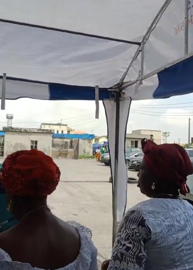 Two women in white lace tops and red headwraps are sitting in white plastic chairs under a white tent. A man in a green patterned suit walks behind them. Cars are parked in the background.