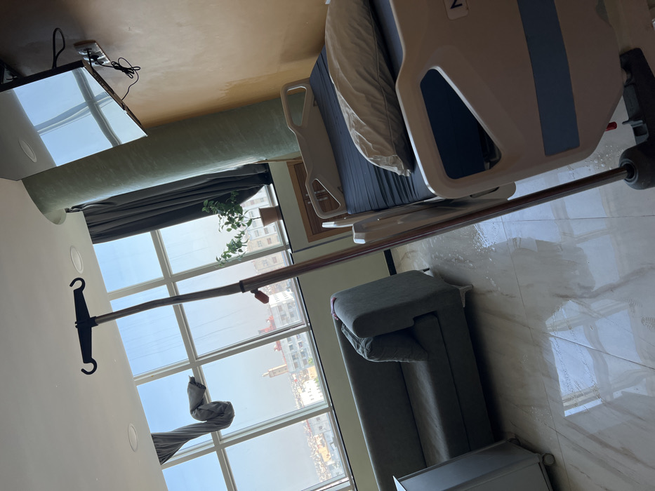 The image depicts the interior of a medical facility room, likely a hospital room or clinic, situated in Casablanca, Morocco. The scene is static, devoid of human presence. In the foreground, a metallic IV pole with a black four-hook top and an orange adjustment clamp stands upright. To its right, a white and light-blue hospital bed with a dark blue mattress and a light grey pillow is present. To the left, a grey two-seater sofa, draped with a grey garment or blanket, is positioned. A white, wheeled cabinet is partially visible in the lower-left corner. The floor consists of large, light-colored, reflective tiles. The room features large, multi-pane windows across the back, providing a high-elevation view of a city under a clear sky. A distinctive clock tower with green roofing, identifiable as the Habous Clock Tower, is prominently visible through the window, confirming the location as Casablanca. Beyond the tower, numerous light-colored, multi-story buildings with flat roofs typical of Moroccan architecture extend into the distance. A small potted plant rests on the windowsill to the right. Dark grey curtains are partially drawn on the right side of the window, and a piece of grey fabric is draped over a window frame section on the left. The walls are painted in a light peach/orange hue, with a prominent cylindrical column covered in a pale green texture. A flat-screen television is mounted high on the right wall, with visible cables beneath it.