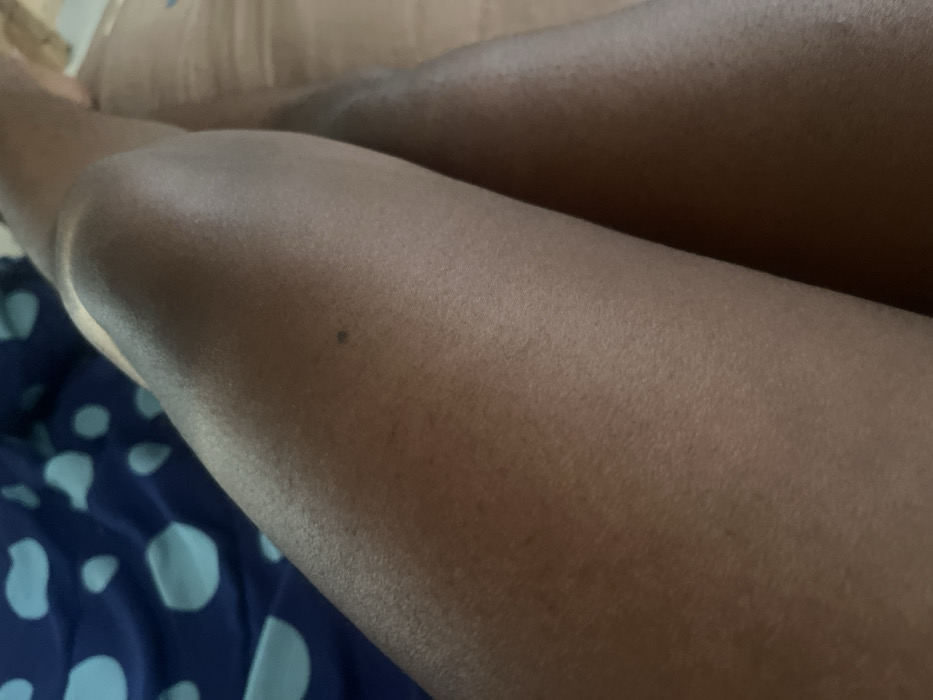Two dark brown thighs are partially visible in the image, with the thigh on the left resting on a blue and white polka dot cloth. The lighting highlights the texture of the skin. A single dark mole is noticeable on the top thigh. The upper portion of the image is less clear, showing a beige-colored fabric behind the thighs.