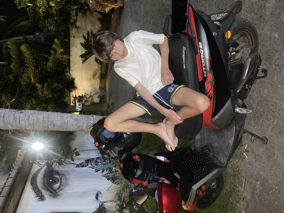 A young man sits sideways on a red and black scooter. He wears a light-colored t-shirt and navy blue shorts with yellow trim. He is barefoot and looks toward the camera. Behind him, there are palm trees and a building. The scooter's license plate is visible. To the left is a helmet and a mural of a face. The scene is illuminated by a street lamp causing lens flare.