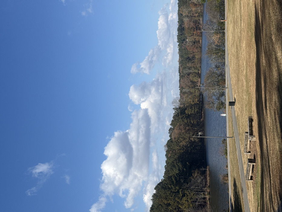 A tranquil landscape under a bright, partly cloudy sky. A calm body of water runs between a dense tree line and a grassy expanse, which fades into a brown hue. Utility poles stand along the water's edge. A picnic area with benches and a paved path is also visible.