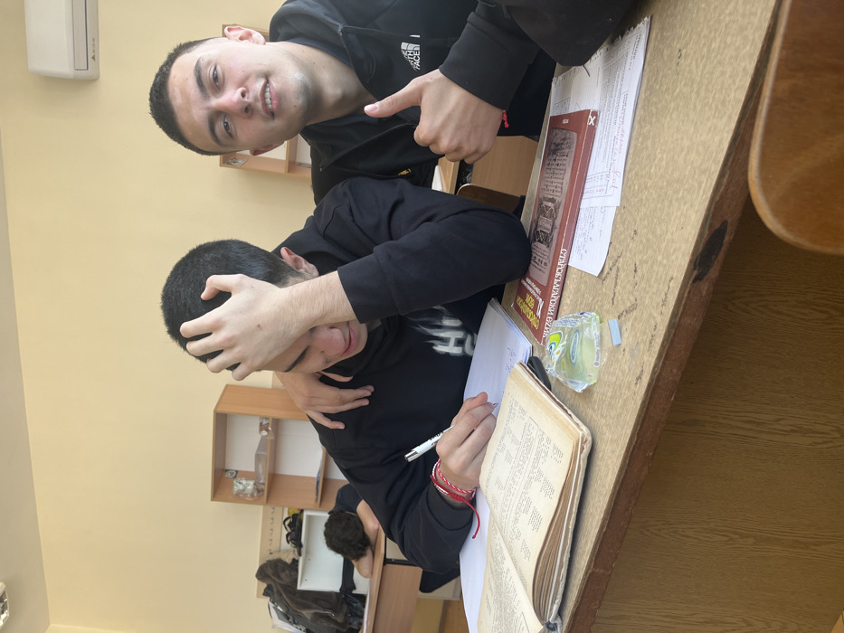 The image depicts a casual scene inside a classroom, identified as being in Sofia, Bulgaria, due to visible Bulgarian text on textbooks. In the foreground, two young males are seated at a light-colored wooden desk. The male on the left, with short dark hair and wearing a black hooded sweatshirt, is actively writing in a notebook with a pen in his right hand. A red and white string bracelet (Martenitsa) is visible on his right wrist. His left hand is placed on his head, suggesting concentration or weariness. An open, aged book with numerous lines of text and a red-covered textbook titled "СТАРОБЪЛГАРСКИ ЕЗИК" (Old Bulgarian Language) are present on the desk in front of him, along with scattered papers, a crumpled clear plastic item, and a small blue rectangular object. The male on the right, with a short fade haircut and wearing a black zip-up hoodie featuring a white "The North Face" logo, is looking directly at the camera with a slight smile. His left arm is around the shoulder of the male on his left, and his right hand is performing a thumbs-up gesture. In the mid-background, to the left, another individual with dark, curly hair is seen resting their head on a separate desk, appearing to be asleep or deeply relaxed. The classroom environment features light beige walls, a partially visible fluorescent ceiling light, a white air conditioning unit mounted on the upper right wall, and wooden shelving units with various items on the back wall. A backpack or pile of clothing is visible on a desk in the far left background.
