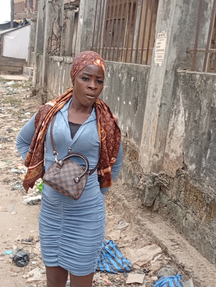 A woman stands outdoors wearing a form-fitting blue dress, a brown headscarf, and a matching brown scarf draped around her shoulders. She also carries a small, checkered brown purse. The background shows an urban environment with a dilapidated building and litter-strewn ground. The scene suggests a lower-income area.