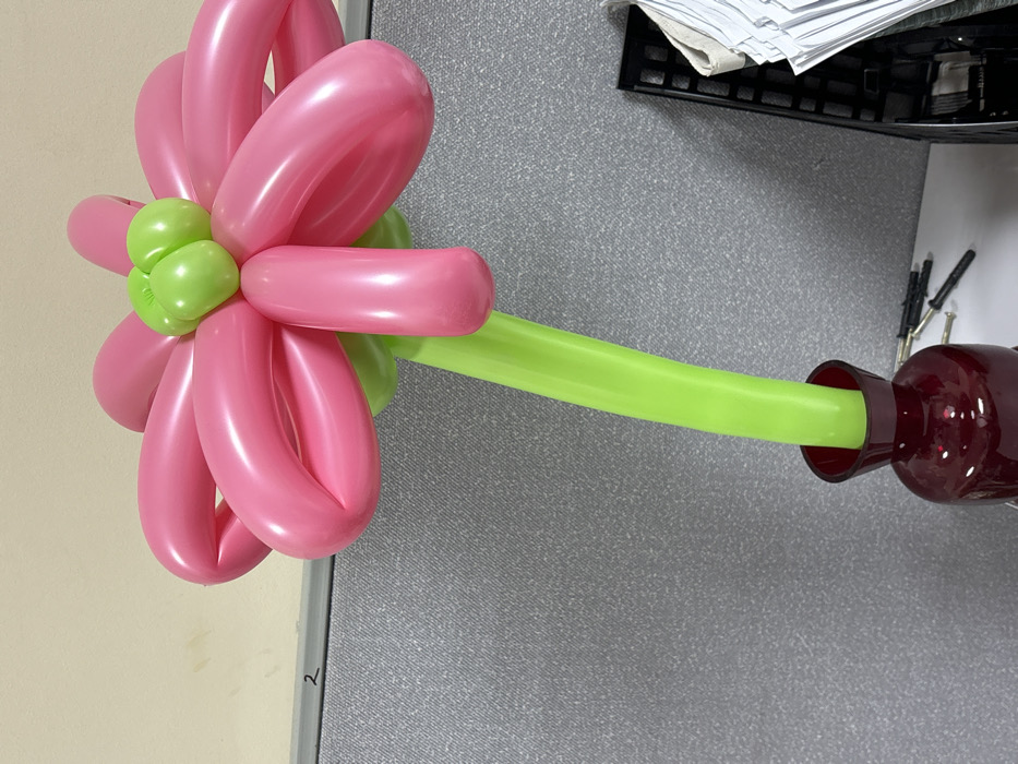 The image displays a balloon flower in a dark red vase, situated on a white desk within what appears to be an office cubicle in Chaikovsky, Russia. The balloon flower features a head composed of approximately eight to nine looped, shiny pink balloon petals, with a center made of four small, spherical light green balloons. A single elongated light green balloon forms the stem, which is inserted into the narrow neck of a glossy, dark red vase. The vase, wider at its base and tapering before flaring at the rim, rests on a white horizontal surface. Behind the vase and balloon flower is a gray, textured cubicle partition, likely fabric-covered, with the black number "2" visible in the upper left quadrant. Above the partition, a light beige wall or vertical surface is present. To the right of the vase on the white surface, a black desk organizer filled with white papers is visible, along with several small, dark-colored tools scattered between the vase and the organizer. No individuals are present in the scene, and no actions or interactions are depicted.