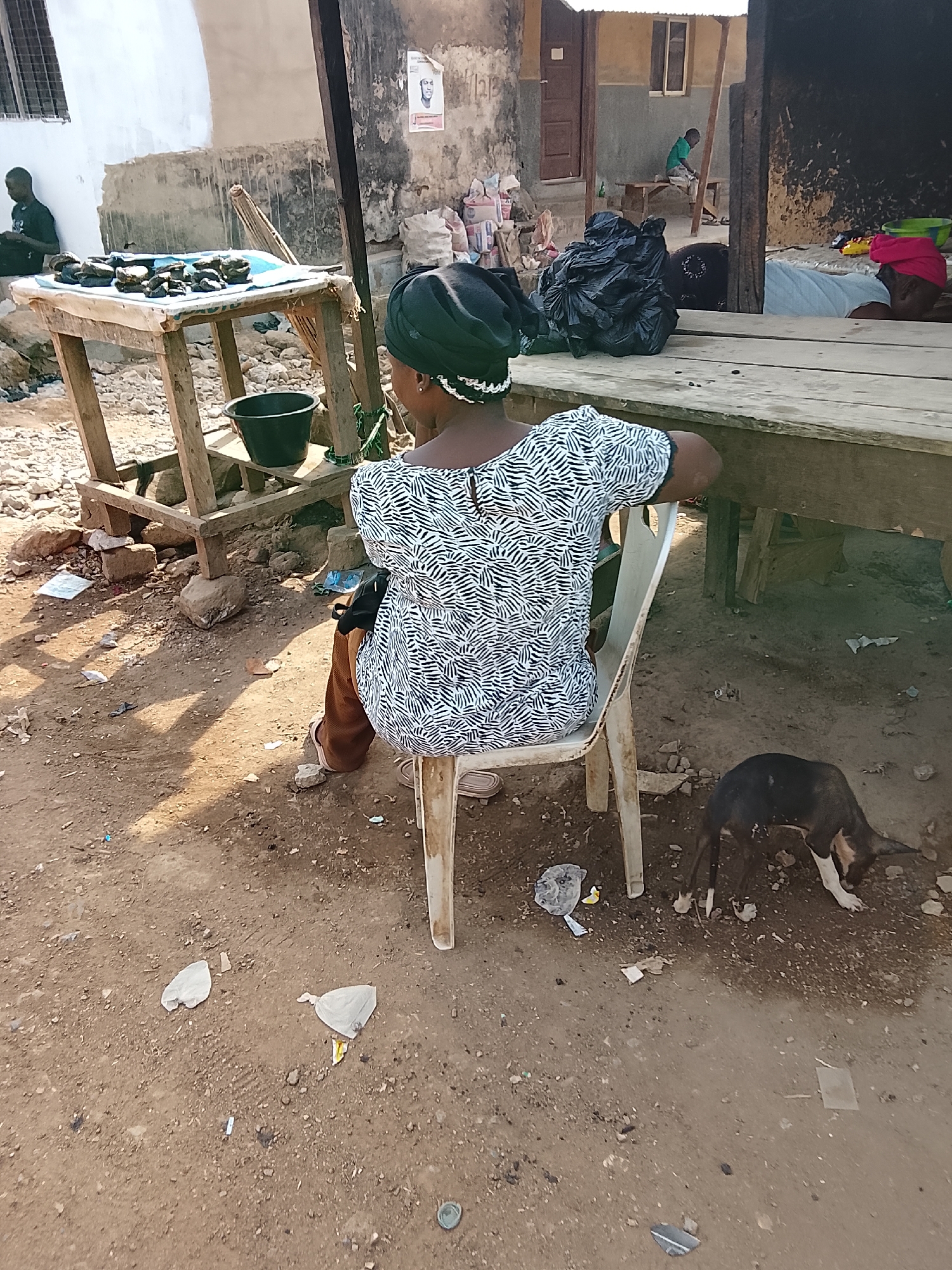 This image captures an outdoor market or informal settlement scene within Abuja, Nigeria, under direct sunlight. **Foreground:** A female individual, viewed from behind, is seated on a white plastic chair. She wears a black headwrap, a short-sleeved top with a black and white geometric pattern, brown trousers, and sandals. To her right, a medium-sized dog, predominantly black with tan/white markings on its snout, chest, and paws, is observed with its head down, sniffing the dry, reddish-brown dirt ground. The ground is uneven and littered with scattered debris, including small plastic bags and paper scraps. **Mid-ground:** To the left of the seated woman, a makeshift vendor's stall constructed from rough wooden planks is present. Its top surface, covered by a light blue cloth, displays approximately a dozen dark, irregular objects, consistent with items for sale such as snails or tubers. A black plastic bucket rests on a lower tier of this stall. Behind the stall, a male individual in a dark shirt is seated against a white, weathered building with a barred window. A faded political poster, featuring a black and white portrait, is visible on the building's wall. To the right, a long, low wooden table or platform stretches across the scene. A large, black plastic bag containing unknown contents rests on this platform. Further right, beneath a dark, sheltered structure, another individual, possibly female, is lying down on the wooden platform, partially visible in a light blue top and a red headwrap. **Background:** In the distant center-background, an individual in a green shirt is seated on a wooden bench within an open structure, adjacent to a brown building with a wooden door and a small window. The overall environment consists of simple, semi-permanent structures and unpaved, dusty ground, indicative of a bustling, lived-in area.