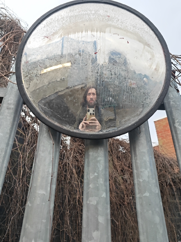 - "The image displays an adult male taking a selfie, as reflected in a round, convex safety mirror with a black rubberized rim" by FM-XRse82, licensed under CC BY 4.0