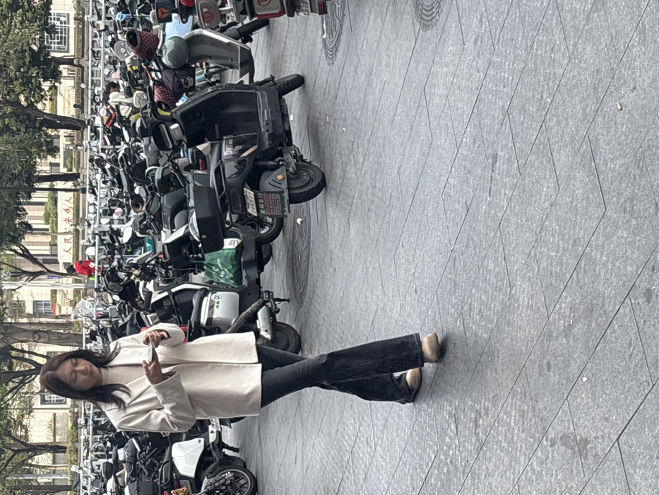 A woman in a light-colored coat and dark pants stands on a gray patterned sidewalk, holding a phone or similar device in her hands. She's surrounded by rows of parked motor scooters, packed closely together along the street. A building and trees are visible in the background. The image seems to be taken at a slight angle, with the scooters appearing to stretch into the distance.