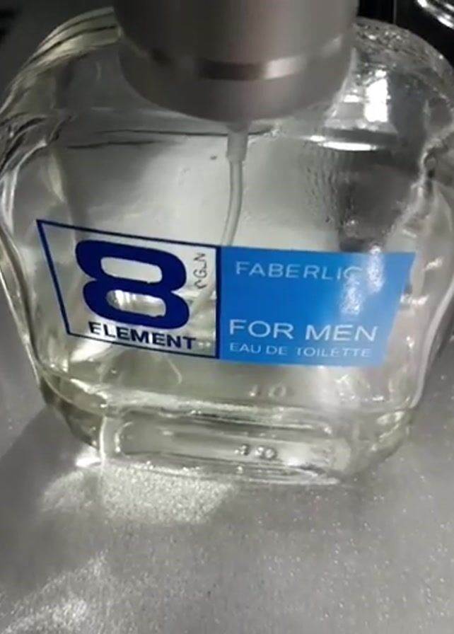 A close-up shot shows several perfume bottles resting on a reflective, possibly metallic, surface. The primary bottle, in focus, is a clear glass bottle with a blue label that reads "8 Element Faberlic FOR MEN EAU DE TOILETTE". Its cap is silver. To the right is a black perfume bottle, partially visible, with white lettering on its label. A hand moves the bottle with the black label to reveal another clear perfume bottle with a decorative silver cap. All bottles appear to be surrounded by a shiny material, possibly silver wrapping.