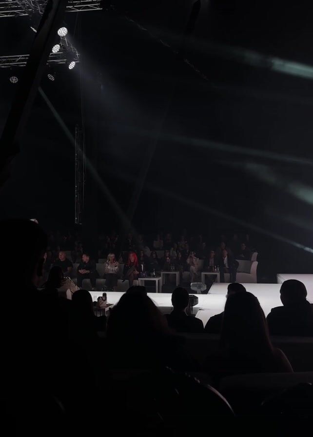 A woman is walking down a fashion runway. She is wearing a dark, sheer dress that trails behind her. The runway is white and illuminated by spotlights. On either side of the runway is an audience seated in chairs. A large pink screen at the end of the runway displays the text "Edis Pala". The room is large and dark, with a network of overhead lights and structures.