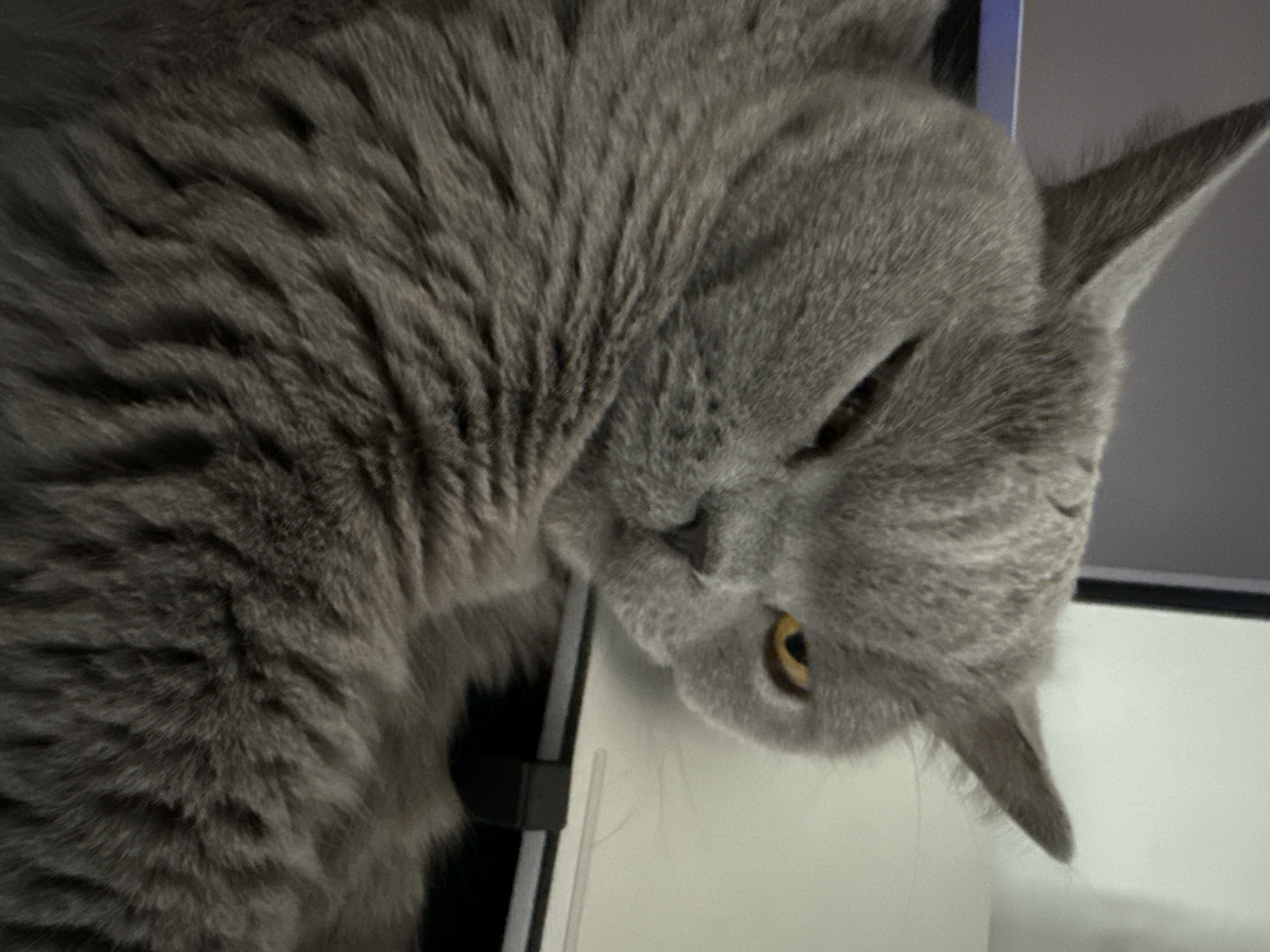 A domestic cat, characterized by its dense, blue-grey fur, is depicted in a close-up, indoor portrait. The animal is in a relaxed, reclining posture, with its head slightly tilted towards the viewer. Its right eye (viewer's left) is fully open, displaying a distinct amber iris. The left eye (viewer's right) is partially closed or squinted, indicative of a relaxed or sleepy state. Both ears are erect and pointed upwards. The background on the upper left comprises a dark, out-of-focus surface, consistent with an electronic display or monitor, exhibiting a subtle blue horizontal reflection. To the right, a lighter, off-white vertical surface is visible, partially obscured by a black, rectangular clip or stand and a thin white horizontal element, likely a cable or edge of another object. The scene occurs within an interior environment. No specific visual markers are present within the image to determine a precise location in Plovdiv, Bulgaria.