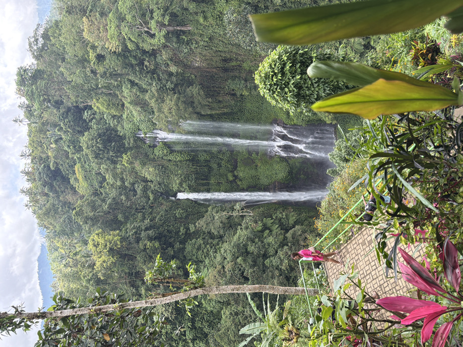 A scenic view of a multi-tiered waterfall surrounded by lush green vegetation. The water cascades down the rocky slopes, creating a beautiful spectacle. A viewing platform with a green railing offers a vantage point for tourists to admire the falls. A woman in pink stands on the platform. Exotic plants and trees frame the scene, adding to the natural beauty. The sky is partly cloudy, casting a soft light over the landscape.