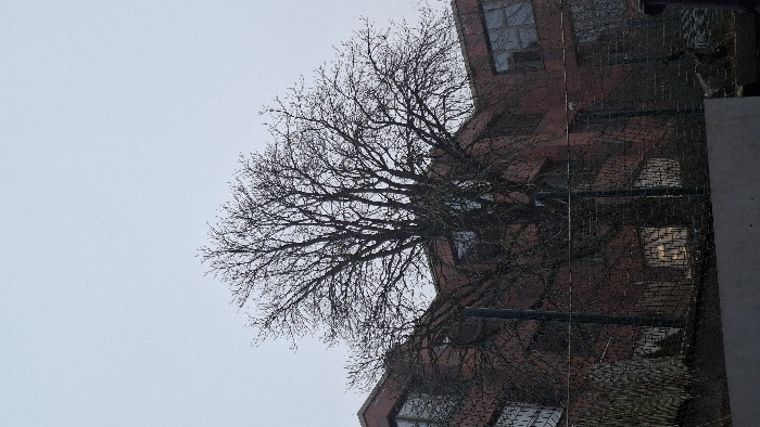 The image captures an exterior scene in Differdange, Luxembourg, under an overcast sky. A large, leafless deciduous tree, displaying a dense network of bare branches, dominates the central and upper portions of the frame. Behind the tree, a multi-story building with reddish-brown brick or paneling is visible, featuring multiple rectangular windows that reflect the grey sky. A dark-colored chain-link fence with vertical support posts extends horizontally across the midground, partially obscuring the lower section of the building and the tree trunk. Sparse, dormant vegetation is present behind the fence on the left side. A low, grey concrete barrier forms the base of the foreground. No people are visible, and no actions or interactions are depicted. The environment suggests a cold season, likely winter or early spring, characterized by diffuse, even lighting from the overcast conditions.