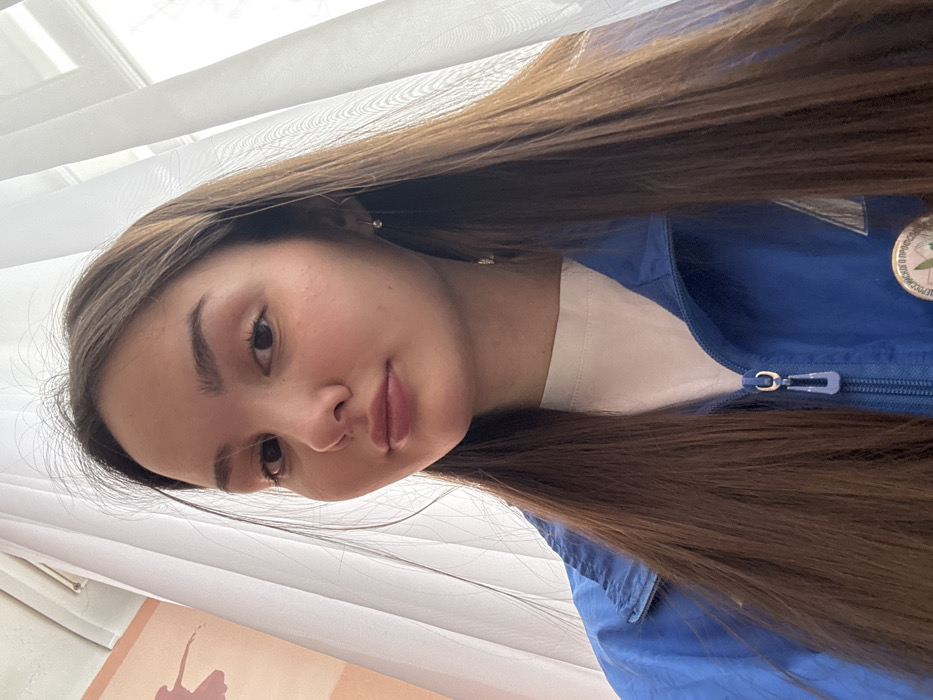 A portrait photograph captures a young female subject from the chest up, positioned indoors. The individual possesses long, straight, medium-brown hair, parted down the middle, and a fair complexion. Her expression is neutral, with lips slightly parted. A small, clear stone earring is visible in her right earlobe. She is dressed in a plain white crew-neck t-shirt underneath an open blue zip-up jacket. The jacket features a circular patch on its lower left side, displaying a green stylized tree or plant motif and Cyrillic text which reads "Всероссийский проект" (All-Russian project). The background on the right consists of white translucent curtains, partially obscuring a window that allows diffused natural light into the scene. To the left, a light peach or orange-colored vertical surface is visible, upon which a faint, darker silhouette resembling a human figure in a dynamic pose is discernible. The specific location within Tayshet, Russia, is not discernible from the visual information provided.