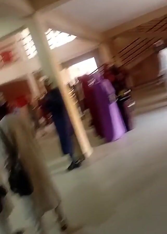 interior of a building with a tile floor and white walls. Several people are present, many wearing traditional Muslim attire including robes and caps. Some individuals are standing in groups, while others are walking around. One person is using a smartphone. A staircase can be seen in the background. The lighting is bright, and the overall atmosphere appears to be one of casual gathering.