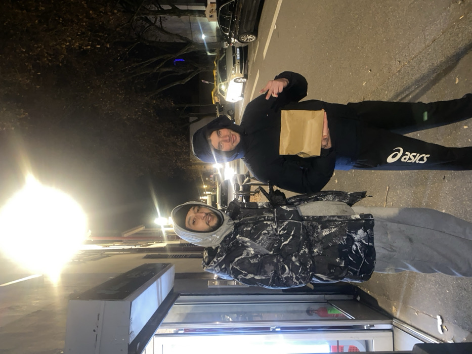Two young men stand outdoors at night. The taller one, wearing a hooded black jacket and black Asics sweatpants, holds a brown paper bag and makes a hand gesture. The other, wearing a grey and white patterned jacket, is closer to the camera, with his hood up as well. They stand in front of a building, with street lights illuminating the scene. Cars are parked on the street.