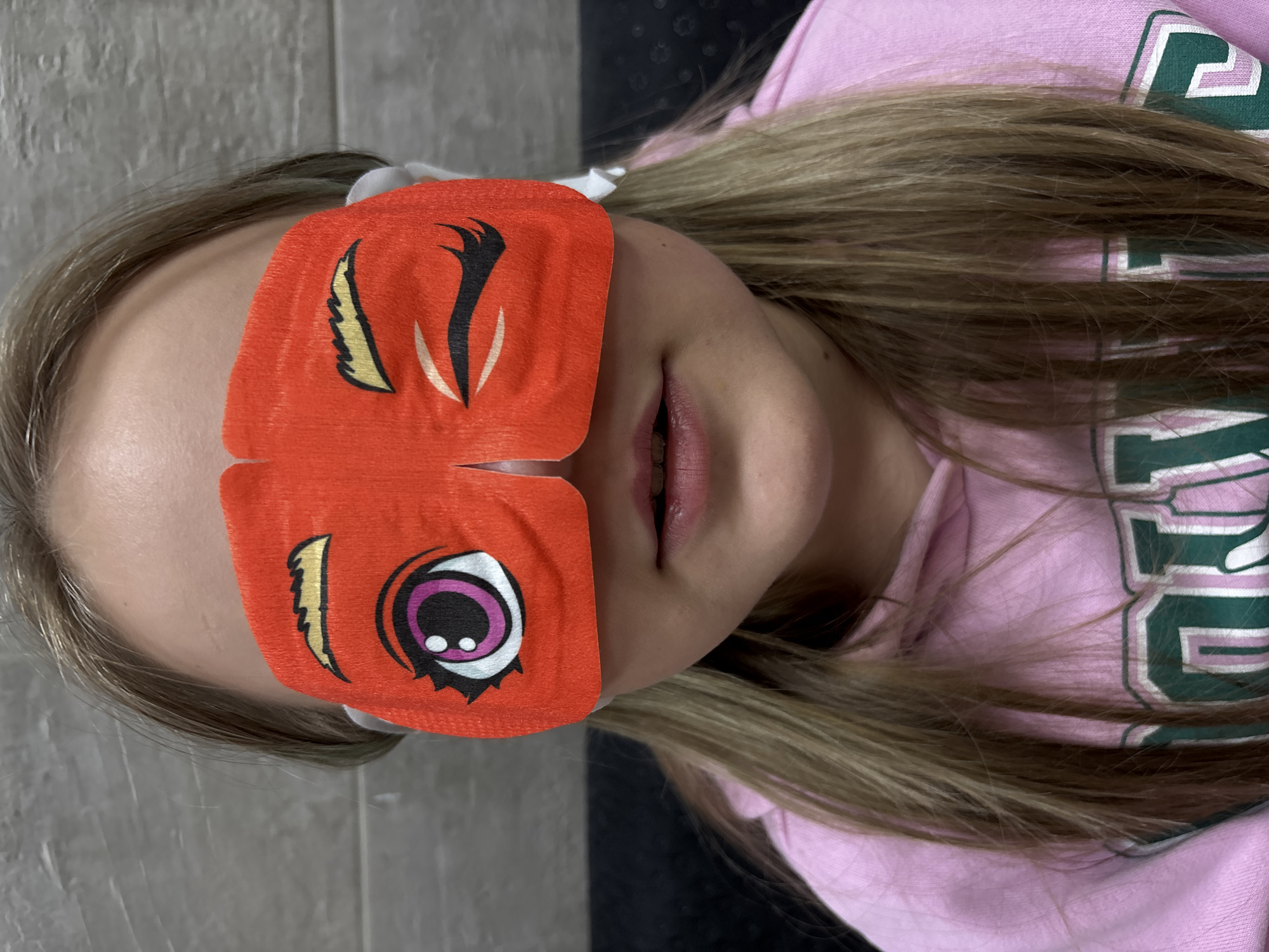 A person with long blonde hair wearing a pink sweatshirt and an orange sleep mask with cartoon eye designs is lying down