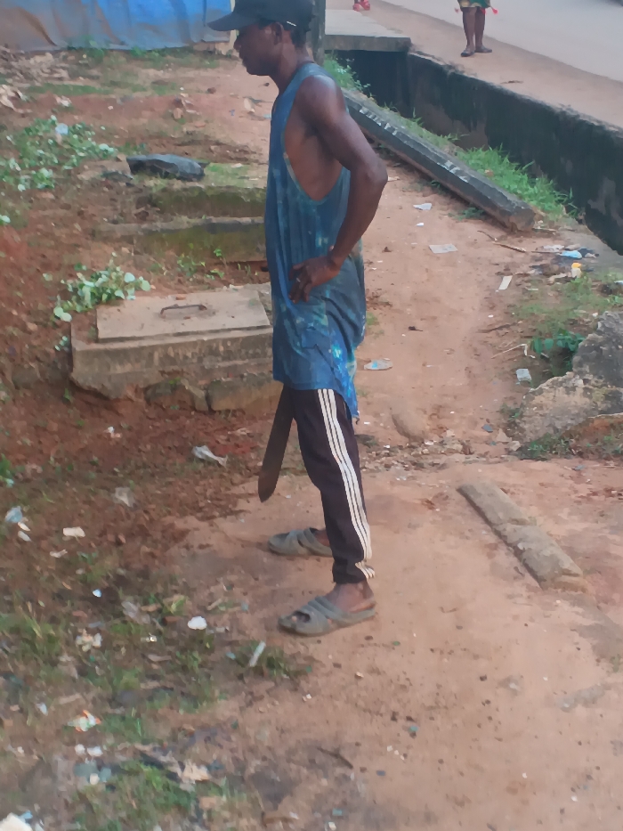 An outdoor scene in Onitsha, Nigeria, shows a dark-skinned male standing in profile, facing left. He is wearing a dark baseball cap, a light blue patterned sleeveless tank top, dark athletic pants with two white stripes on the outer leg, and grey slip-on sandals. His right hand is positioned on his hip. A long, dark-bladed machete is visibly suspended from his left hip, extending downwards past his knee. The ground consists of reddish-brown dirt, uneven in texture, with scattered debris and sparse green vegetation. To the man's left, on slightly elevated ground, is a rectangular concrete slab or manhole cover. To his right, a concrete drainage ditch runs horizontally, containing a dark, elongated object and further vegetation. In the distant background, on an elevated paved surface, two additional human figures are partially visible. A blue tarp is present in the upper left background.