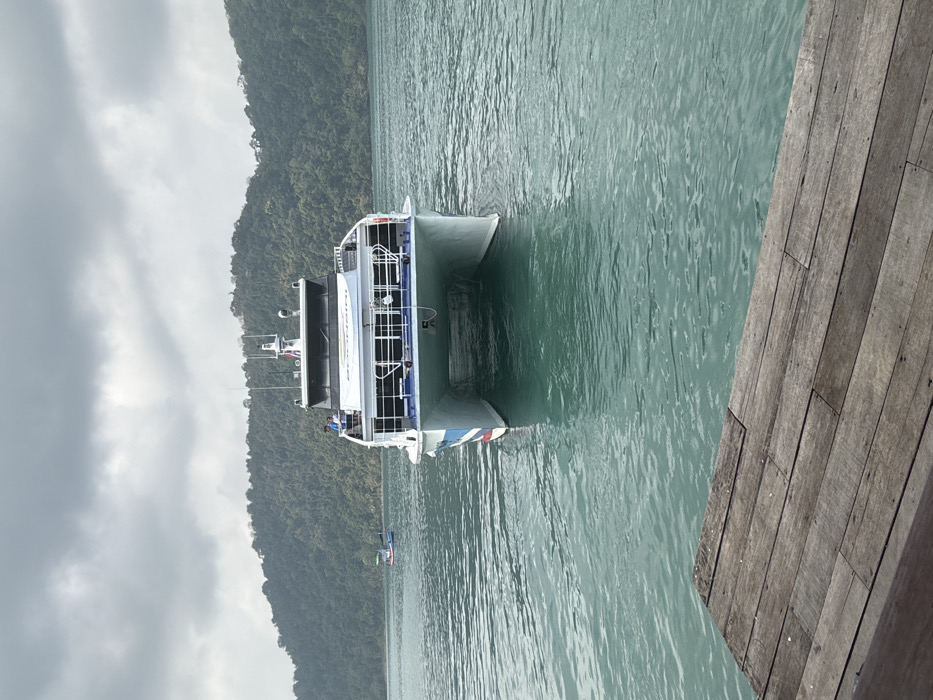 A white catamaran rests in calm, turquoise water alongside a wooden dock. Dense, green foliage covers the distant hills. The catamaran features a multi-story structure with railings. The dock consists of weathered wooden planks. A paddler appears in the distance. A cloudy sky casts an overcast light over the scene.