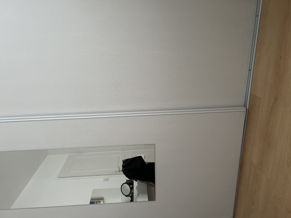 A low-angle shot shows a section of white wooden panelling on a wall, with a sliver of wood flooring visible in the upper right