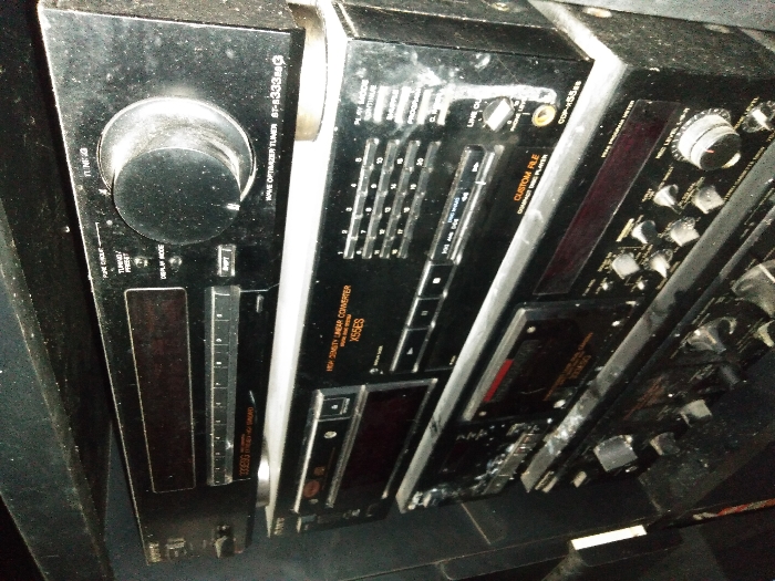 Four vintage black Sony audio components are stacked vertically in a dimly lit, dusty environment