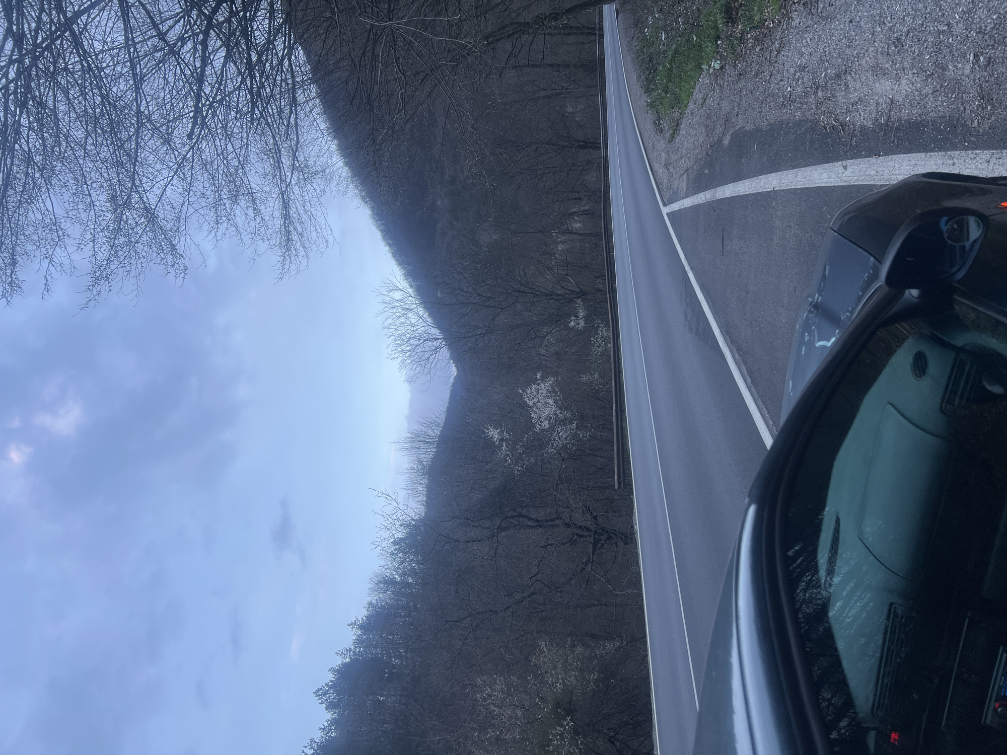 A roadside view shows a two-lane road bordered by a wooded area. The road surface is gray and marked with a white line. Part of a dark-colored car is visible on the right side of the frame. The trees in the background are mostly bare, suggesting a late fall or winter season. The sky is overcast. The image was likely taken in a mountainous region near Kotel, Bulgaria.