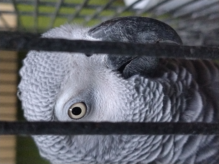 - "A close-up vertical image depicts the head of an African Grey Parrot (Psittacus erithacus) observed through the black metal bars of a cage" by FM-M4lpO2, licensed under CC BY 4.0