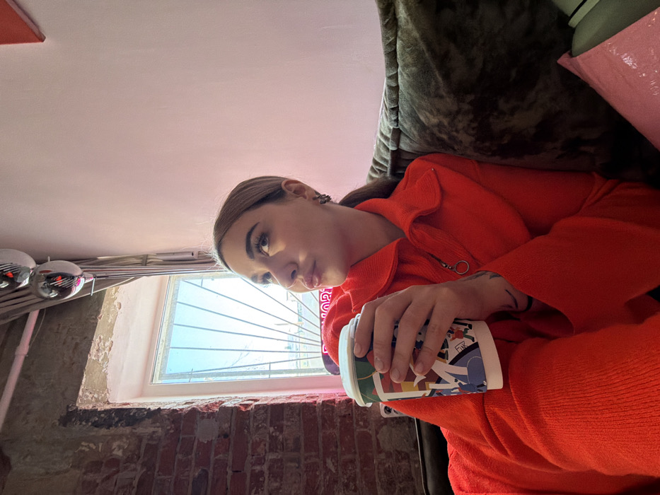 The image displays an indoor scene located in Sergiyev Posad, Russia. A female individual, identified by her light brown hair styled in a ponytail, is seated on a dark patterned sofa. She wears a bright red, collared, long-sleeved top with a visible zipper pull featuring a silver ring. A tattoo is discernible on her left forearm. The subject is holding a white disposable cup, decorated with a multicolor graphic print, in her right hand. Her gaze is directed upwards and to her left (viewer's left), with her lips slightly pursed. To her left, a window with white framing and vertical security bars provides a view of a bright, clear sky and distant structures. Adjacent to the window, an exposed brick wall exhibits patches of missing plaster. Above the window, two small, reflective, spherical objects are suspended from the ceiling. The wall behind the subject and to the right of the window is painted a solid light pink. A pink padded envelope or package is partially visible on the sofa in the lower right corner of the frame.