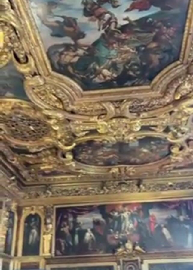 ornate ceiling of a room, likely a palace or museum. The ceiling features large, framed paintings filled with figures in classical or religious scenes, set against a light blue sky background. The frames are elaborate and gilded with gold. Beneath the ceiling, a large painting spans the length of a wall. The room appears empty except for a person with short blue hair visible in the lower portion of the frame. The camera pans slowly across the ceiling, emphasizing the intricate details of the paintings and the gold embellishments.