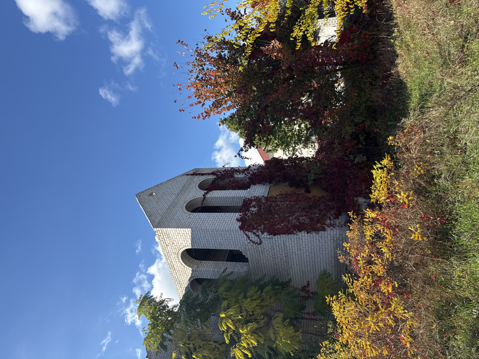 An unfinished white brick building with arched openings stands amidst vibrant foliage. Red ivy climbs one section of the structure. Yellow, orange, and red trees and bushes surround the building's base. The ground is covered in dry grasses and some green vegetation. A bright blue sky with scattered clouds provides the backdrop.