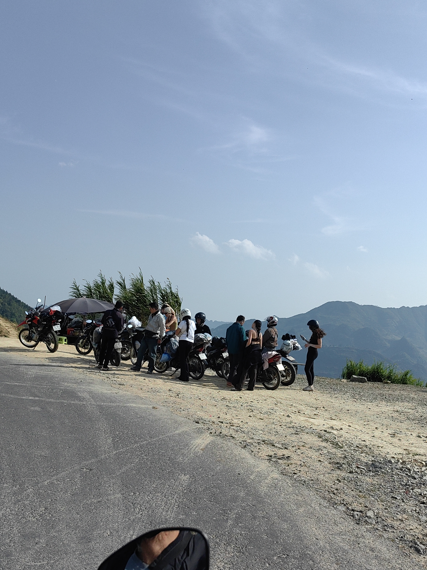 The scene depicts a group of people on a scenic overlook in Lũng Cú Commune, Vietnam. Several motorcycles are parked along the side of a paved road, where it meets a dirt and gravel area. A small cart with an umbrella is positioned near the motorcycles, suggesting a rest stop or vendor. The people are standing near their motorcycles, some looking out at the mountainous landscape in the background, while others appear to be interacting with their phones or each other. The sky is clear with some light clouds.