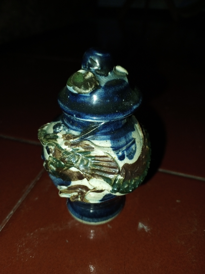 - "A small, lidded ceramic vessel is positioned centrally on a reddish-brown tiled surface" by FM-zVPRH2, licensed under CC BY 4.0