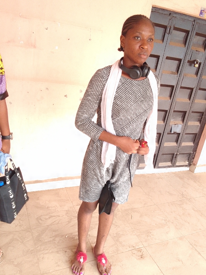 A young woman stands on a tiled floor in Nkwelle Ezunaka, Nigeria, against a light peach-colored wall and a dark brown paneled double door with a silver padlock