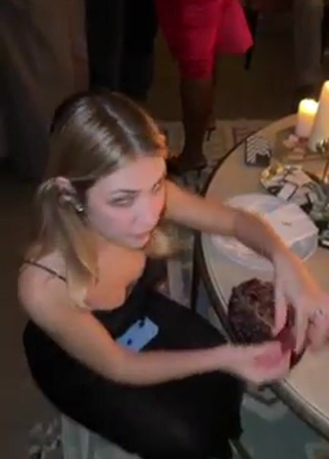 A woman with blonde hair wearing a black dress is seated at a round table indoors. The table is decorated with candles, plates, and a bunch of red grapes. Several people are standing in the background, and a person in a red dress is particularly visible. The woman picks up a grape and eats it while looking at the camera. She says "Merry Christmas" as she eats. The camera then shifts down and back to the table.
