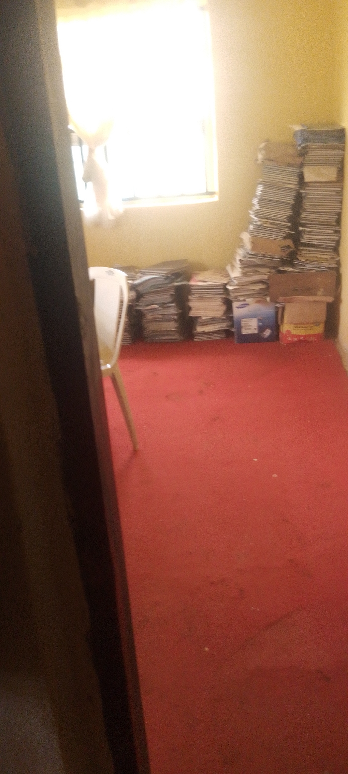 The image depicts the interior of a room, identified as being in Ogbogbo, Nigeria, though specific geographic indicators are not discernible within the visual content. The perspective is from an open doorway, with a dark, vertical doorframe or wall edge obscuring the left third of the frame. The floor is covered by a solid red carpet exhibiting minor surface irregularities and dust. The room's walls are painted a light yellow or cream color. A large rectangular window on the far wall is heavily overexposed, emitting bright white light that obscures exterior details; a translucent, light-colored curtain hangs on its left side. A single white plastic chair with a light-colored frame is positioned in the left-midground, facing away from the camera, its back partially visible behind the doorframe. Along the far wall, primarily to the right of the bright window, are numerous tall, organized stacks of what appear to be papers, books, or bundled materials. At the base of these stacks, two cardboard boxes are visible: a blue box bearing the "Samsung" brand logo and a partially obscured brown box to its right. No individuals, activities, or interactions are present in the scene.