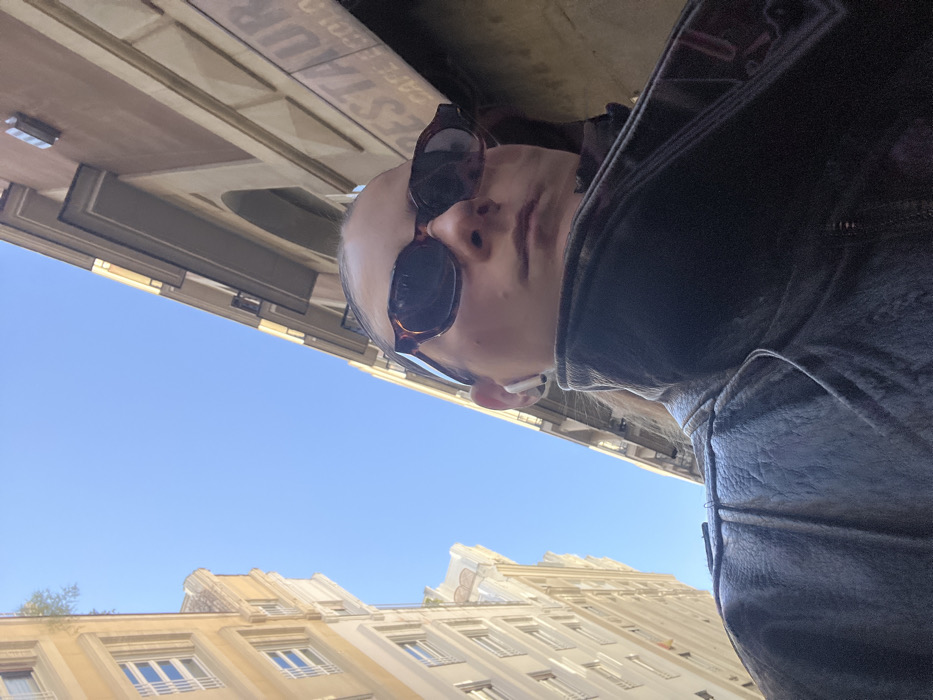 The image presents a low-angle perspective of an individual standing on a narrow street in Madrid, Spain, looking upwards. The subject, a female, occupies the lower right and center of the frame, with her right profile visible, wearing dark tortoiseshell sunglasses and a dark leather jacket with a high collar. A white earbud is inserted into her left ear. Above the individual, a clear, bright blue sky spans the upper central portion, flanked by two multi-story buildings. The building on the left exhibits a light-colored facade with several rectangular windows. The building on the right features a brownish-red facade with architectural cornices and arches, displaying a partial sign that reads "RESTAURANT" and "CAFE & GELAT." The scene is brightly lit by direct sunlight, casting distinct shadows.